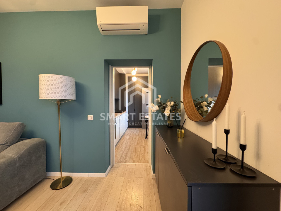 Proprietatea este complet mobilată cu mobilier executat pe comandă și dotată cu electrocasnice de ultimă generație: TV Smart, mașină de spălat rufe și vase. Atmosfera este caldă și primitoare, cu accente de culori vii care dau energie și bună dispoziție.