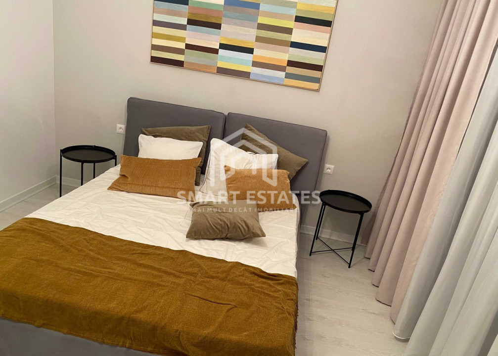 Mobilier nou: canapea extensibilă, pat matrimonial, dulapuri, spații de depozitare generoase.