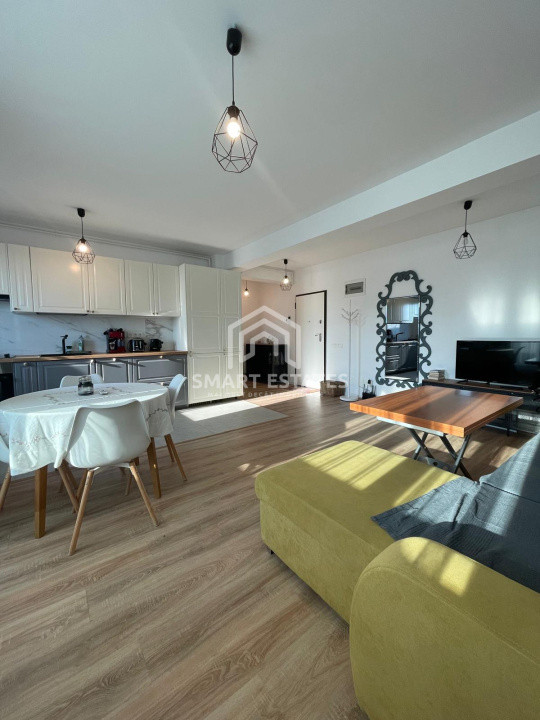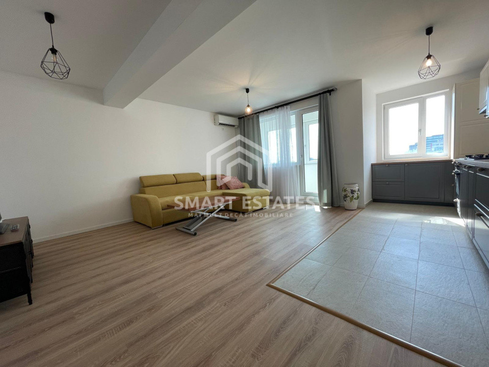 Apartamentul in suprafata de 60 mp este semidecomandat, living spatios cu bucatarie deschisa, este mobilat si echipat modern, centrala termica - incalzire in pardoseala, AC, balcon 4 mp inchis.