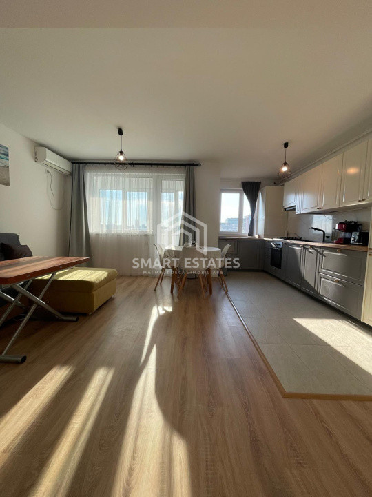 Apartamentul in suprafata de 60 mp este semidecomandat, living spatios cu bucatarie deschisa, este mobilat si echipat modern, centrala termica - incalzire in pardoseala, AC, balcon 4 mp inchis.