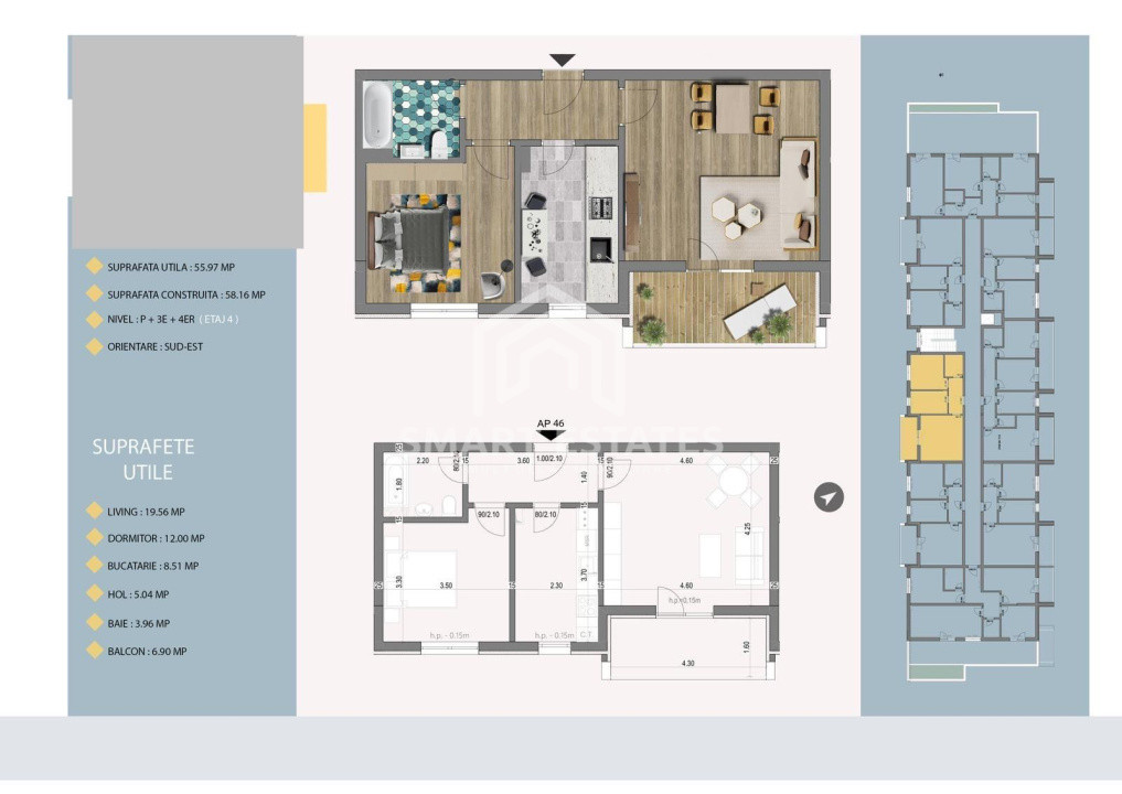 - Suprafață totală: 56 mp