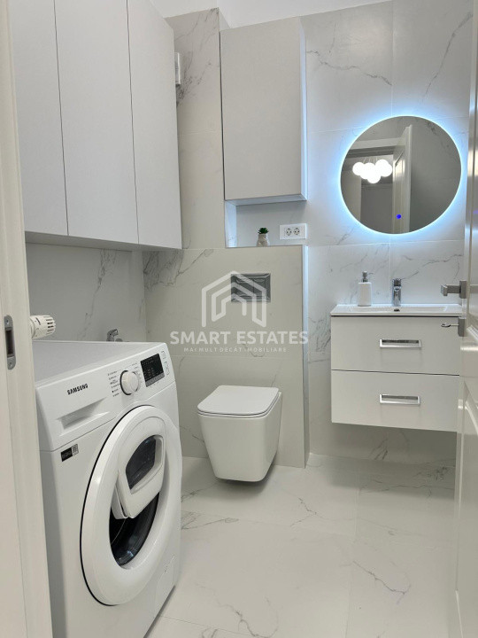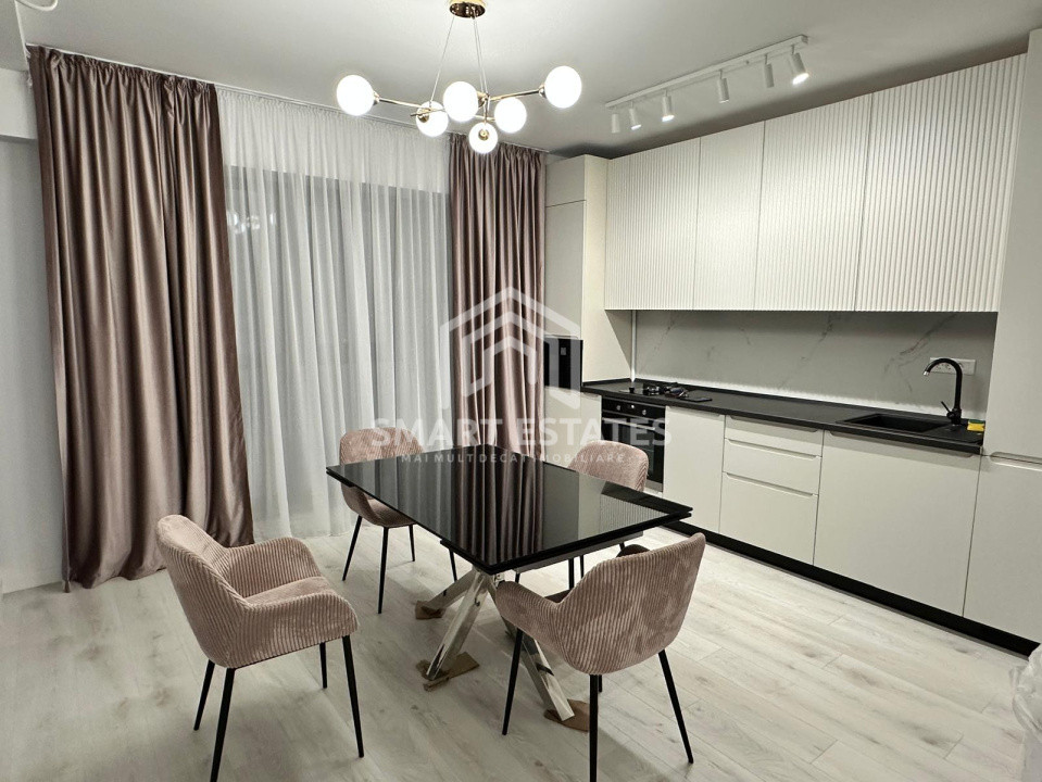 Apartamentul este complet mobilat și utilat, cu mobilier din MDF realizat pe comandă. Bucătăria este modernă și complet echipată cu electrocasnice Samsung și Bosch. Livingul este primitor, cu TV și șemineu electric, iar dormitorul este mobilat la comandă și dotat cu TV. Baia este spațioasă, cu finisaje de calitate, iar spațiile de depozitare sunt atent optimizate. Exact ca in poze.