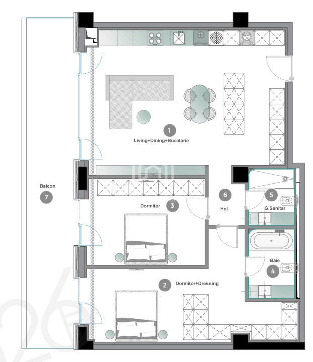 - Spatii de depozitare bine integrate, dresing in dormitorul matrimonial