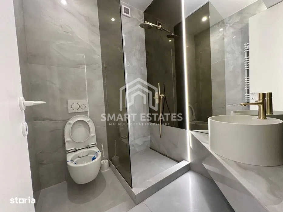 A doua baie cu cabină de duș walk-in și spații de depozitare