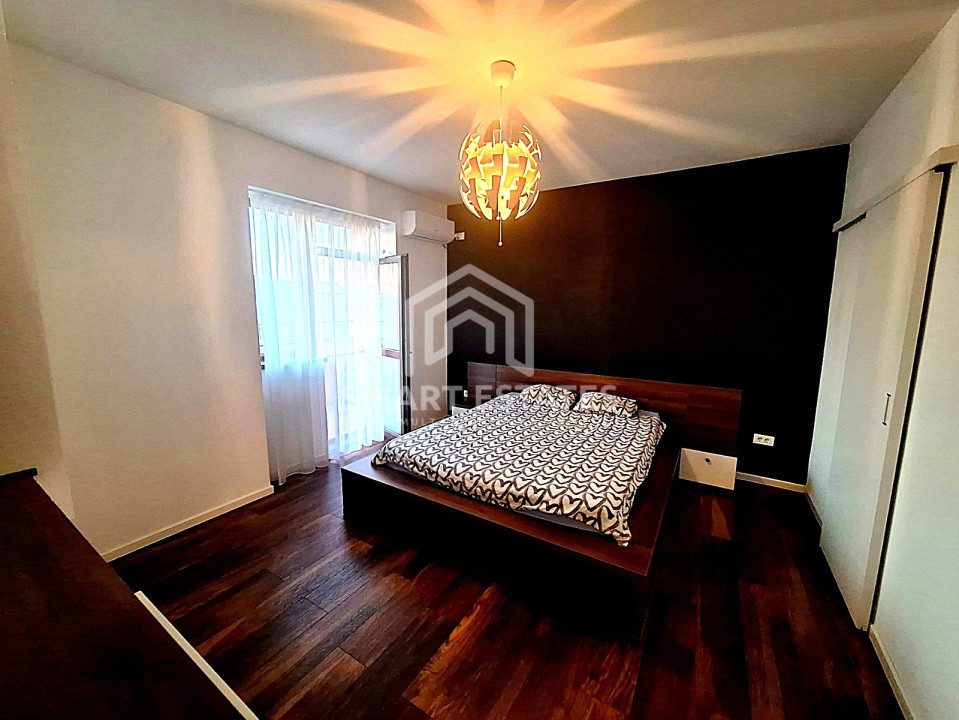 Dispune de un living luminos , TV, AC, 2 dormitoare cu pat matrimonial, dressing incapator, 2 bai.