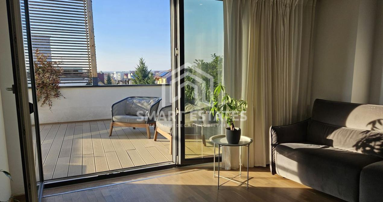 Apartamentul se întinde pe tot nivelul etajului 3 al unui imobil tip boutique, cu un regim mic de inaltime, P+2+3R, cu doar 7 de apartamente. Este spațios, luminos, cu suprafețe vitrate foarte mari și vedere liberă panoramică asupra vilelor din zonă, a SkyTower și a Casei Presei. De pe terasele pline de verdeață, orientate sud-est și sud-vest, se văd superbe răsărituri și apusuri de soare.