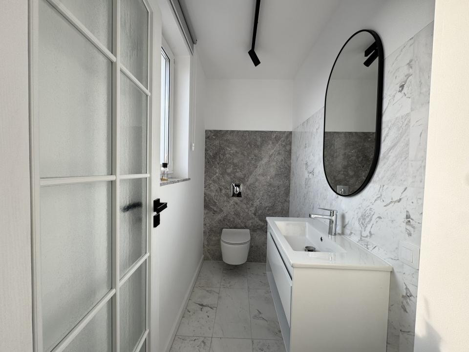 Finisajele sunt premium, atent alese: parchet din lemn masiv, marmură, mobilier realizat la comandă și detalii care conturează un ambient sofisticat, dar primitor.