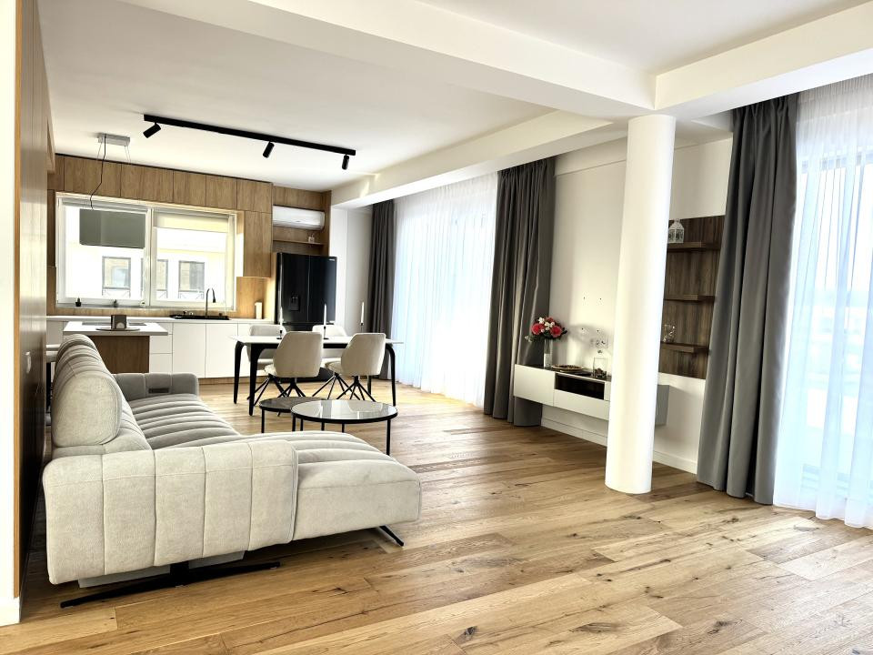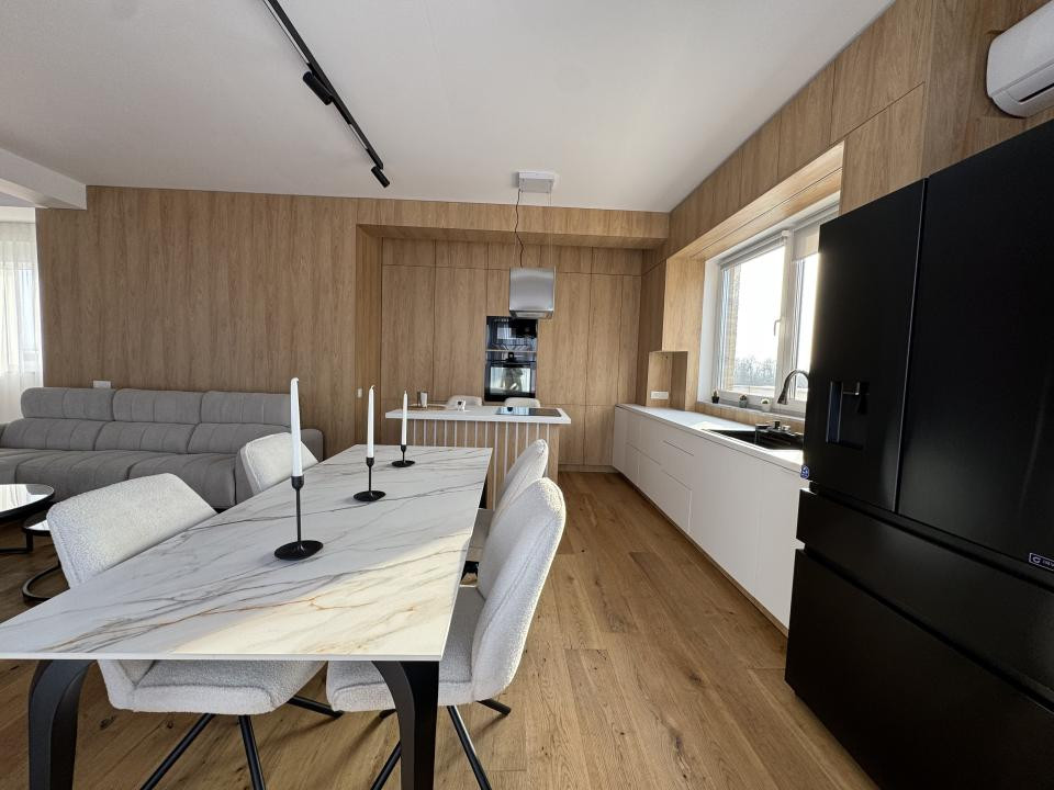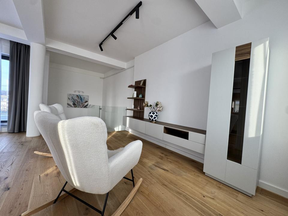Finisajele sunt premium, atent alese: parchet din lemn masiv, marmură, mobilier realizat la comandă și detalii care conturează un ambient sofisticat, dar primitor.