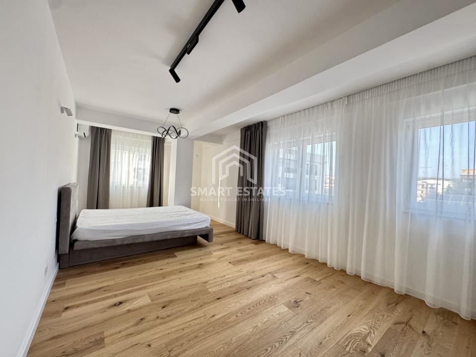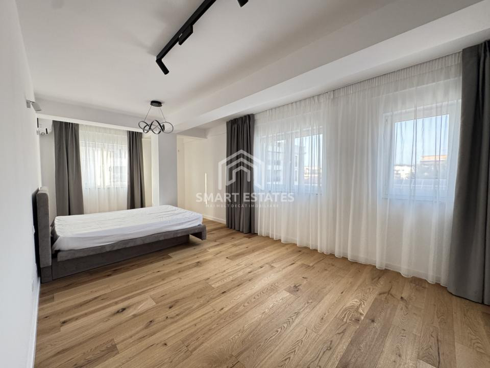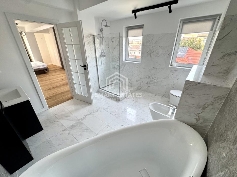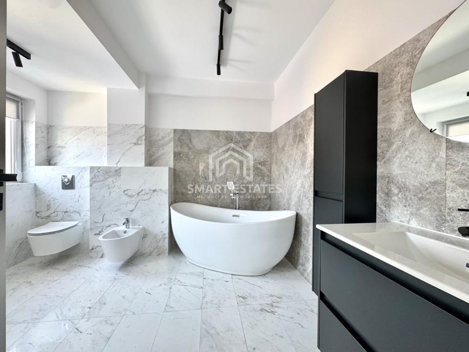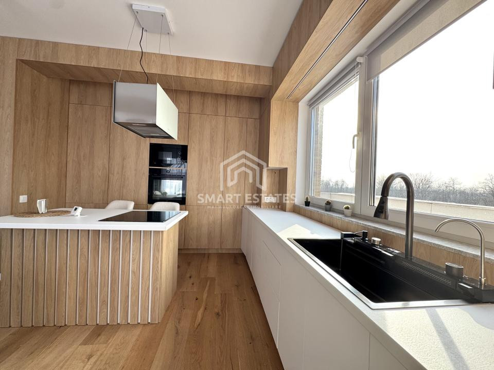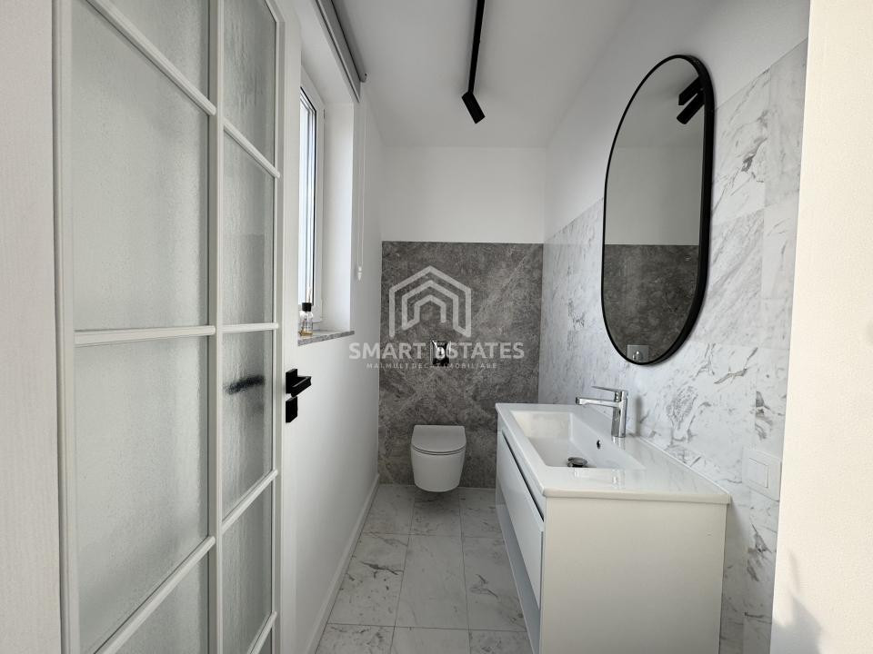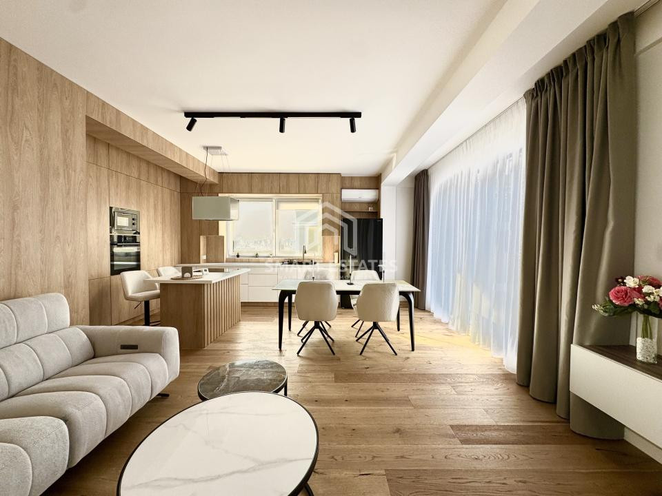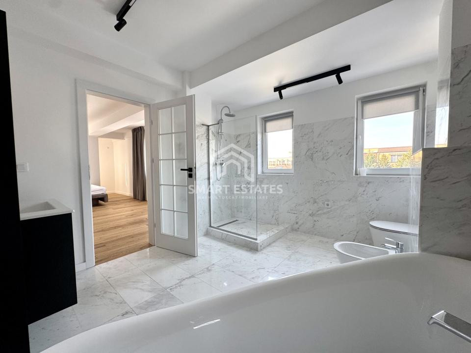 Finisajele sunt premium, atent alese: parchet din lemn masiv, marmură, mobilier realizat la comandă și detalii care conturează un ambient sofisticat, dar primitor.