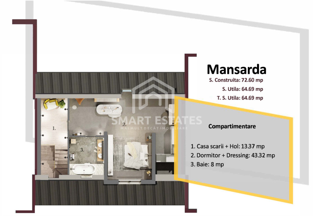 SMART ESTATES vă propune spre vânzare o vilă P + E + M, tip duplex, de 4 camere.