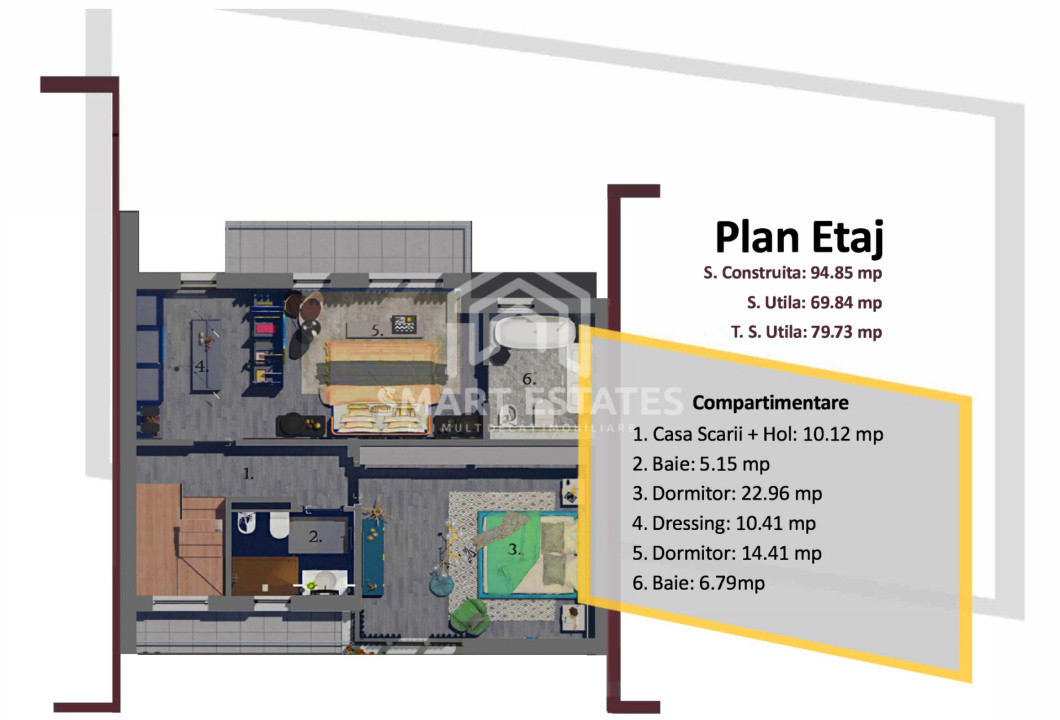 SMART ESTATES vă propune spre vânzare o vilă P + E + M, tip duplex, de 4 camere.