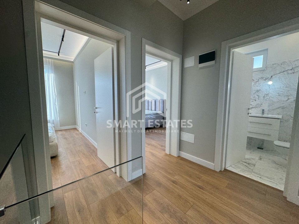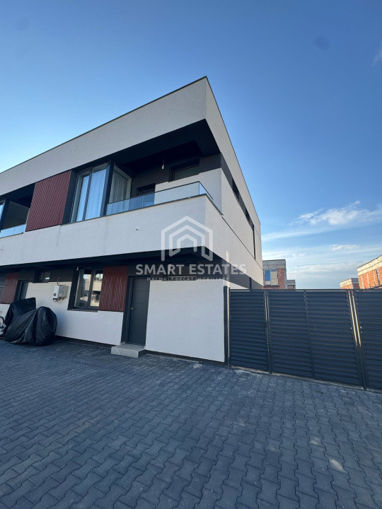 Construcția este modernă, cu finisaje premium: tâmplărie SALAMANDER tripan, parchet SPC pentru trafic intens, travertin natural, uși interioare PINUM, obiecte sanitare și baterii GROHE. Încălzirea se face în pardoseală, prin pompă de căldură, iar costurile sunt reduse datorită panourilor fotovoltaice de 5 KW montate pe fiecare casă. A fost prevăzută inclusiv alimentare trifazică pentru mașini electrice.