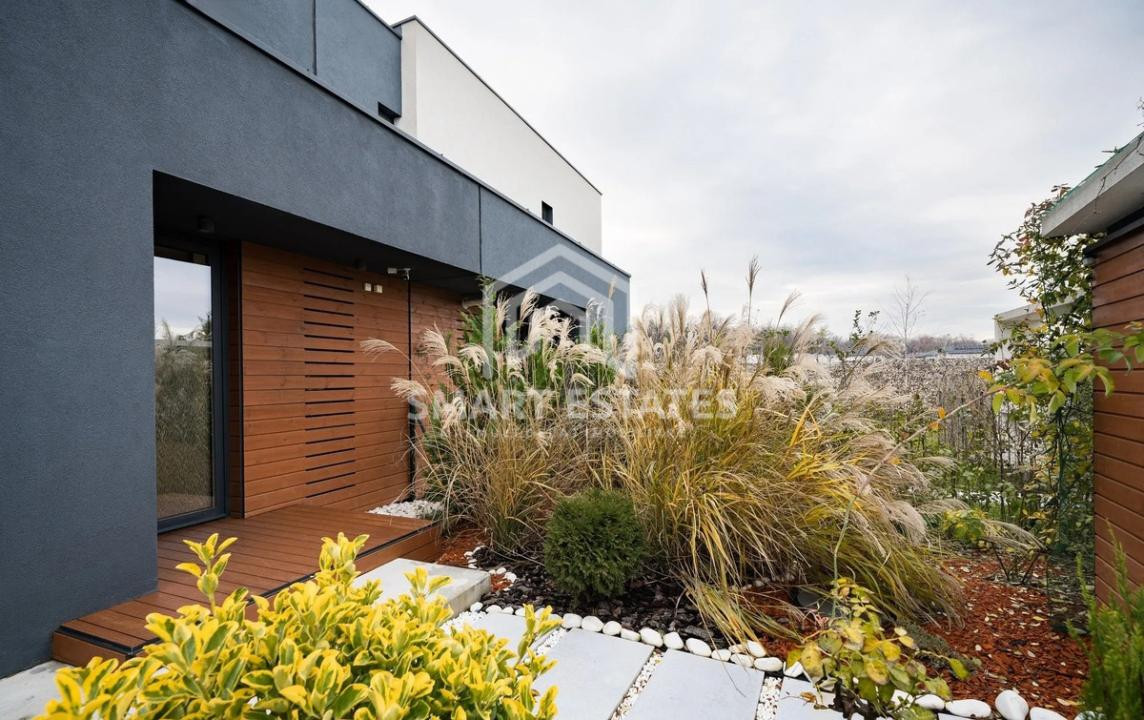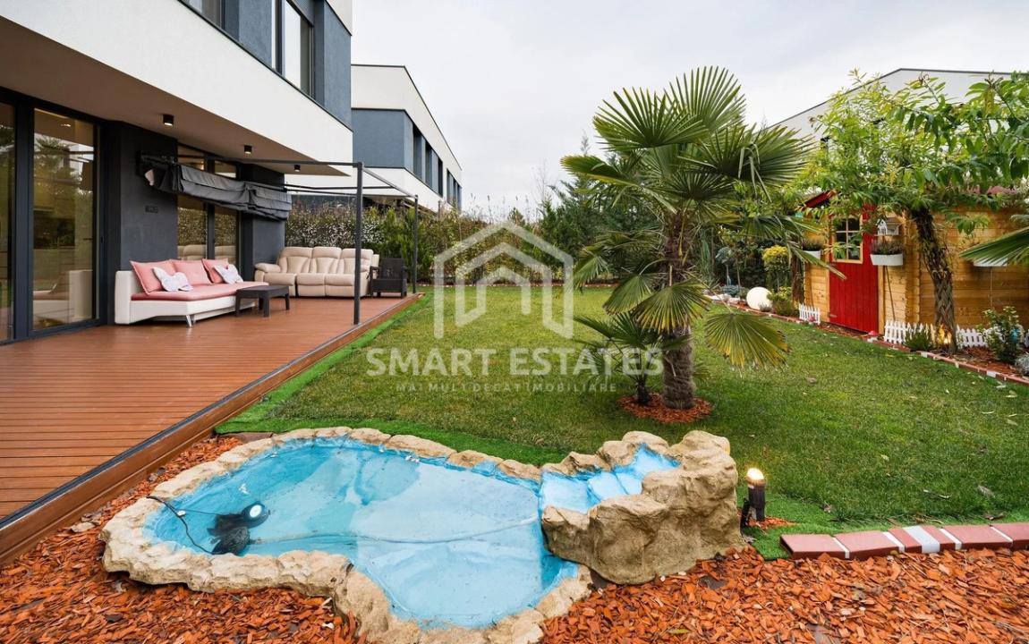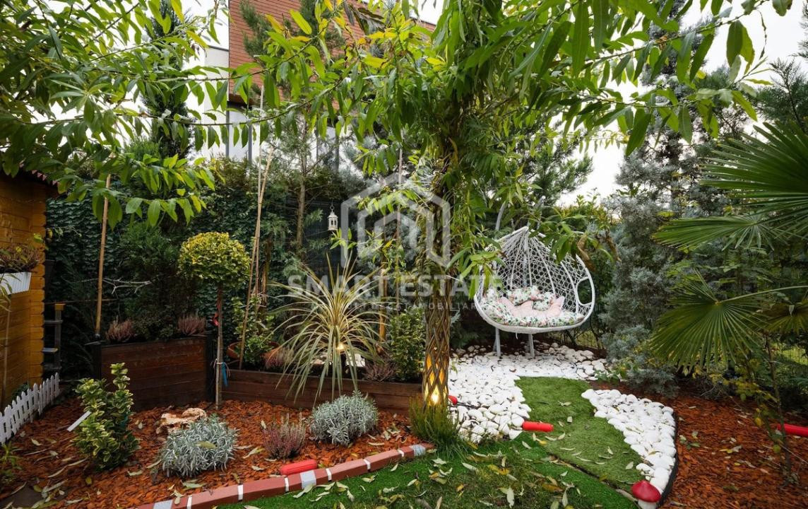 Grădina amenajată, în care s-au investit peste 30.000 €, oferă un spațiu de relaxare deosebit, cu deck, instalație pentru jacuzzi, sistem automat de irigații, vegetație matură, iluminat ambiental, robot pentru gazon și zonă de lounge – un adevărat colț de liniște.