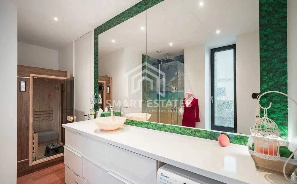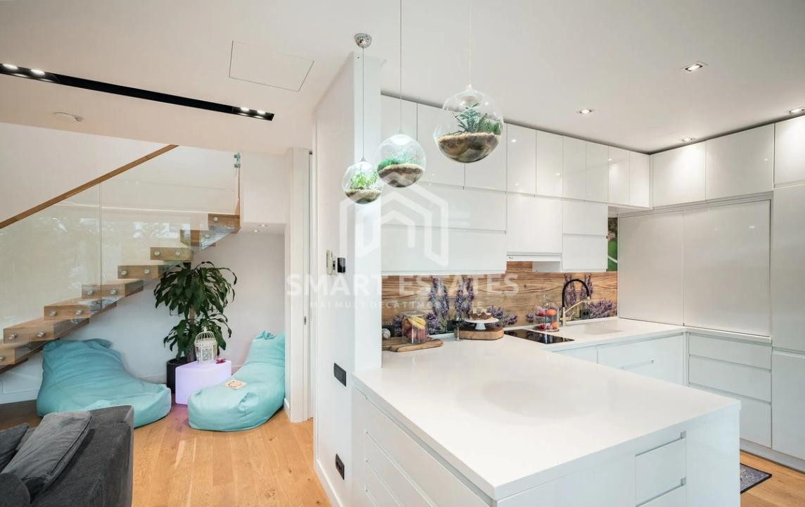 Proprietatea dispune de două dormitoare, un birou, trei băi (inclusiv baie matrimonială cu cadă freestanding și saună), walk-in dressing și bucătărie complet utilată cu insulă și masă extensibilă. Livingul este luminos și elegant, dotat cu șemineu electric și aer condiționat mascat, iar finisajele premium includ parchet exotic, chiuvete din piatră naturală și elemente decorative din sticlă.