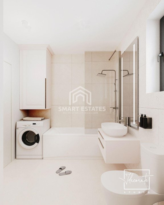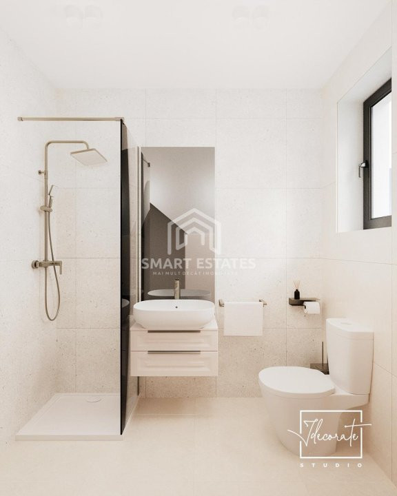 • Mansardă: suprafată de 60 mp cu placă de beton cu șapă armată, izolație cu vată bazaltică de 20 cm, înălțime 3 m la coamă, scară continuă din beton.
