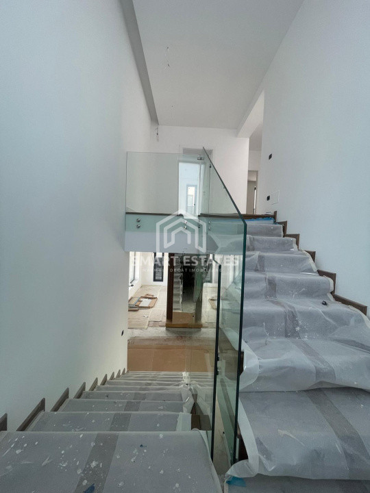 Etaj - Dormitor matrimonial 22 mp + dressing 9 mp + baie proprie 8 mp; Dormitor 19 mp; Dormitor 13 mp; Birou 12 mp; Baie 5 mp, Terasa 5 mp; Hol